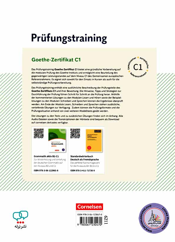 یکی از کاملترین مجموعه کتاب آزمون آلمانی Gothe Institut، کتابهای پروفونگز ترینینگ است. این کتابها از سطح مبتدی تا پیشرفته در چهار بخش آزمون که شامل گفتاری، شنیداری، خواندنی و نوشتنی است، شما را آماده میکنند. سطوح A1 و A2 در ابتدا روی مهارتهای کلی تمرکز دارند؛ اما از سطح B1 به بعد به طور خاص مطالب، تمرینات و مثالها منطبق بر آزمون گوته هستند. هماکنون میتوانید تمام جلدهای این کتاب را از فروشگاه نشر برته خریداری کنید.