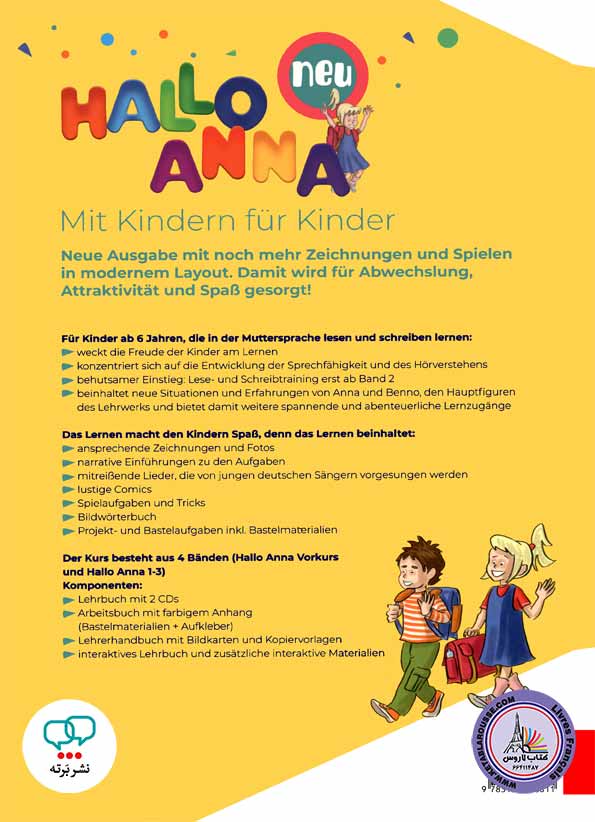 - کتاب زبان آلمانی Hallo anna: از جمله منابع آموزشی محبوب برای کودکان بوده و بهطور اختصاصی برای دانشآموزان مقطع ابتدایی طراحی شده است. این کتاب با استفاده از داستانهای جذاب و شخصیتهای دوستداشتنی مانند آنا و دوستش بنو، زبان آلمانی را به شیوهای بازیمحور و سرگرمکننده به کودکان آموزش میدهد. این کتاب به دلیل ساختار ساده و قابل فهم خود، بهعنوان یکی از بهترین منابع آموزشی برای کودکان بدون تجربه زبانی شناخته میشود.