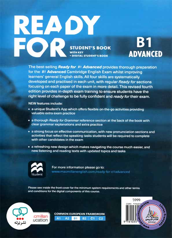 - کتاب آزمون انگلیسی (نسخه چهارم) Ready for Advanced C1: نسخه چهارم این کتاب با حفظ ویژگیهای محبوب نسخههای قبلی، به داوطلبان کمک میکند تا با استفاده از پشتیبانیهای دیجیتال نوآورانه، متون بهروز و بخشهای جدیدی مانند تمرین تلفظ، مهارتهای زبانی خود را تقویت کنند. در جدیدترین نسخه، طراحی صفحات بهبود یافته و به داوطلبان کمک میکند تا بهراحتی به بخشهای مختلف کتاب دسترسی پیدا کنند.