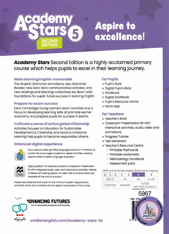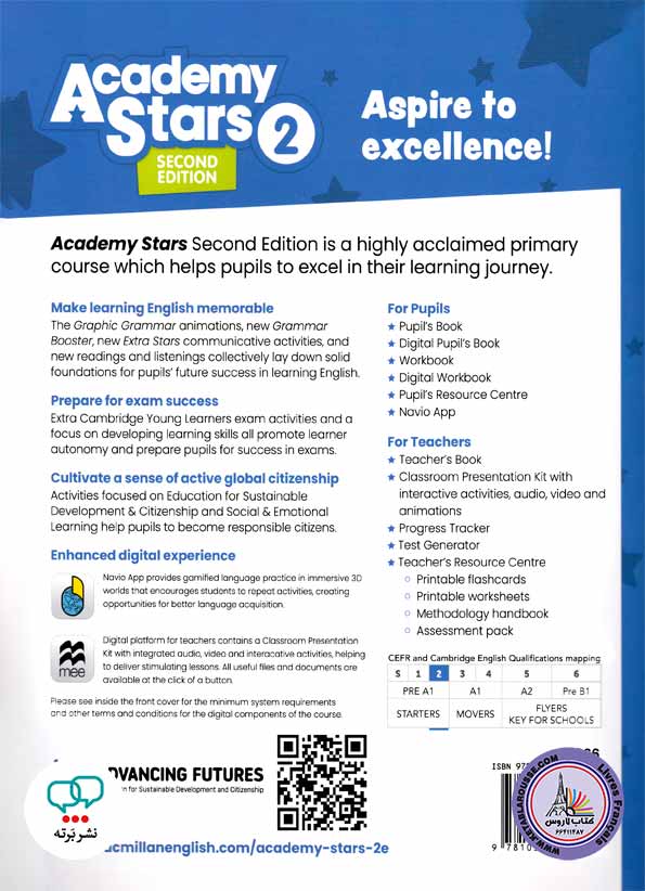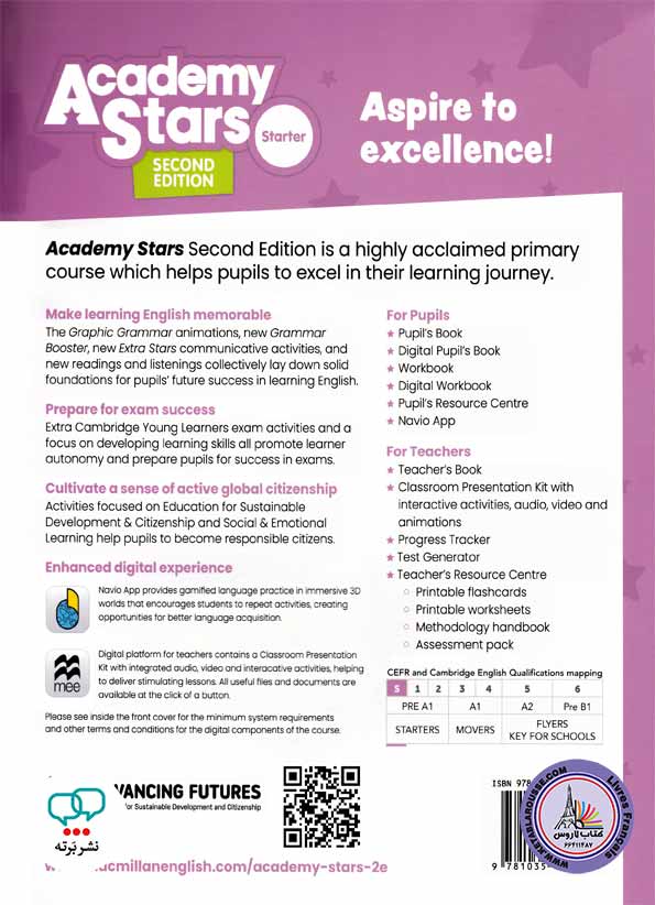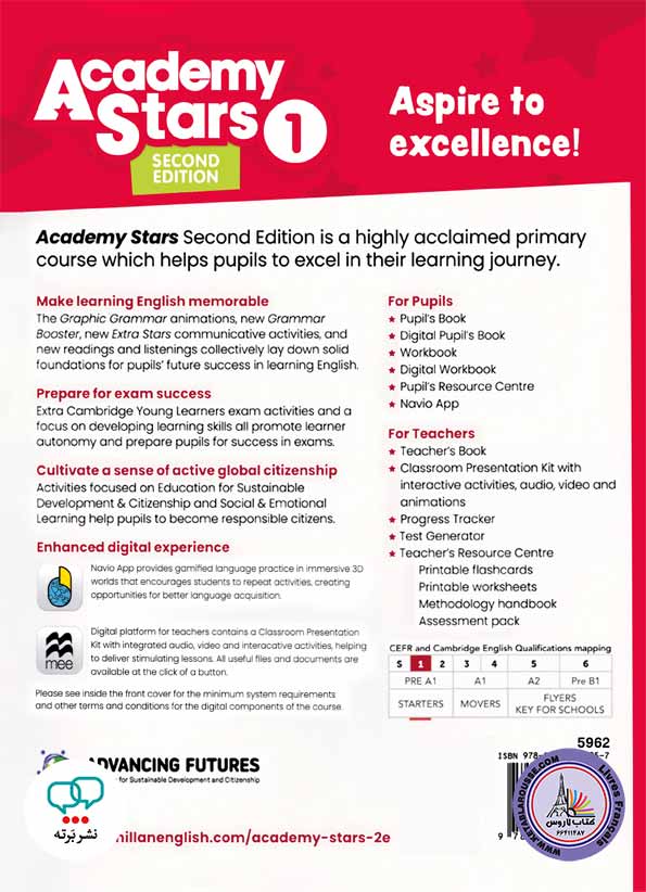 - کتاب انگلیسی آکادمی استارز Academy Star: دومین جلد از مجموعه آکادمی استارز برای کودکانی است که اولین گامهای خود را برای یادگیری زبان انگلیسی برداشتهاند. در این سطح، کودکان با کلمات و جملات ساده بیشتر آشنا میشوند و مهارتهای خواندن و نوشتن خود را تقویت میکنند.