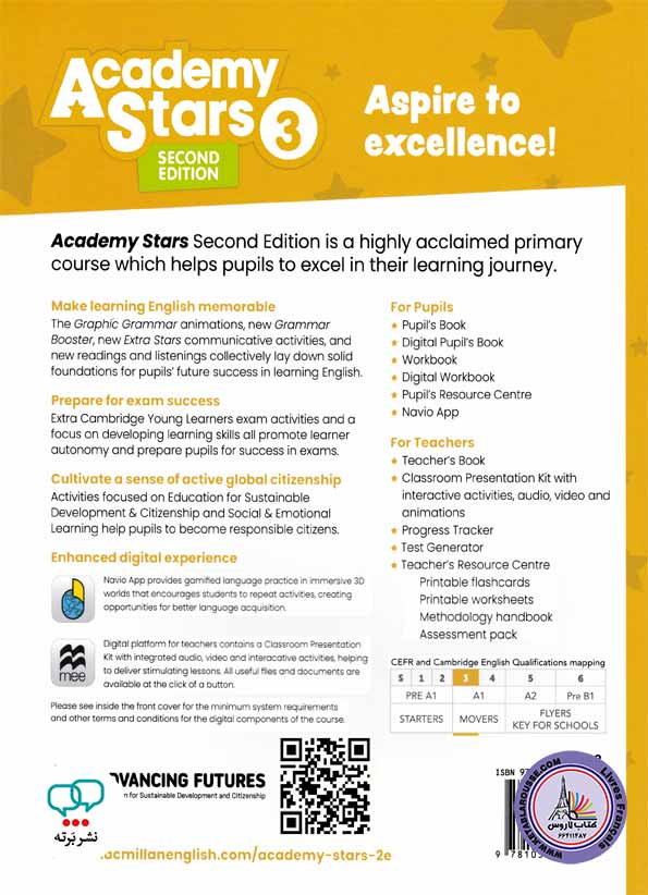 - کتاب انگلیسی آکادمی استارز Academy Stars 3: این کتاب برای زبانآموزانی طراحی شده است که به سطح متوسط زبان انگلیسی رسیدهاند. در این سطح از اکادمی استارز، کودکان با جملات پیچیدهتر و مفاهیم گستردهتری آشنا میشوند و تواناییهای زبانی خود را بهبود میبخشند.