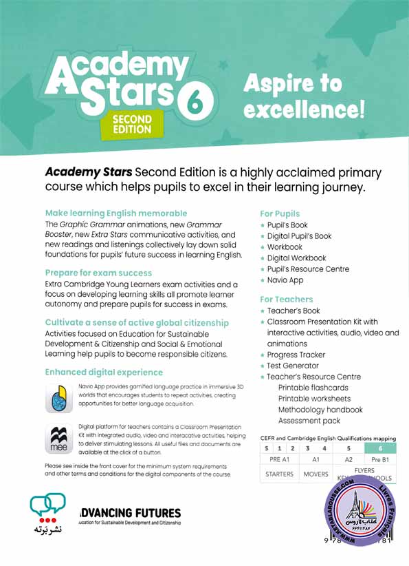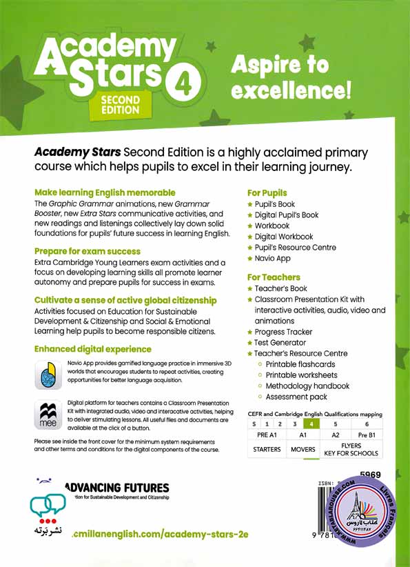 - کتاب انگلیسی آکادمی استارز استارتر Academy Stars Starter: این کتاب برای کودکان در سطح مبتدی طراحی شده و زبانآموزان را با مفاهیم ابتدایی زبان انگلیسی آشنا کند. کودکان میتوانند با مطالعه این کتاب، مهارتهای اولیه مانند شناخت حروف، کلمات ساده و جملات کوتاه را یاد بگیرند.