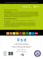 این جلد 18 قسمته شامل موارد زیر می باشد: 2 نمونه آزمون (نوجوانان و جوانان) در سطح B1برای مدرک ÖSD Zertifikat ، توضیحات کامل نمونه آزمون ها همراه با نکاتی برای ارزیابی، توضیحات برای 4 مهارت (خواندن، شنیدن، نوشتن و صحبت کردن)، 2 مدل تمرین (نوجوانان و جوانان) ،پاسخنامه های هر کدام از آزمون ها، نوشتار صوتی هر کدام از نمونه آزمون ها، برگه های ارزیابی آزمون ها، معیار های جهت ارزیابی آزمون های نوشتن و صحبت کردن