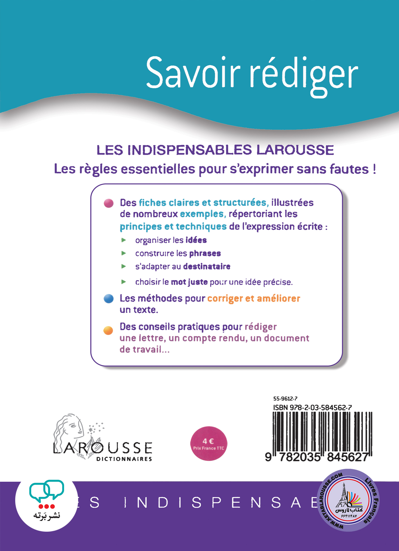 Larousse – Savoir rediger کتاب پیش رو ابزاری ضروری برای مهارت افزایی در نگارش زبان فرانسه می باشد تا نوشتاری بدور از خطاهای معنائی و دستوری به انجام رسد .