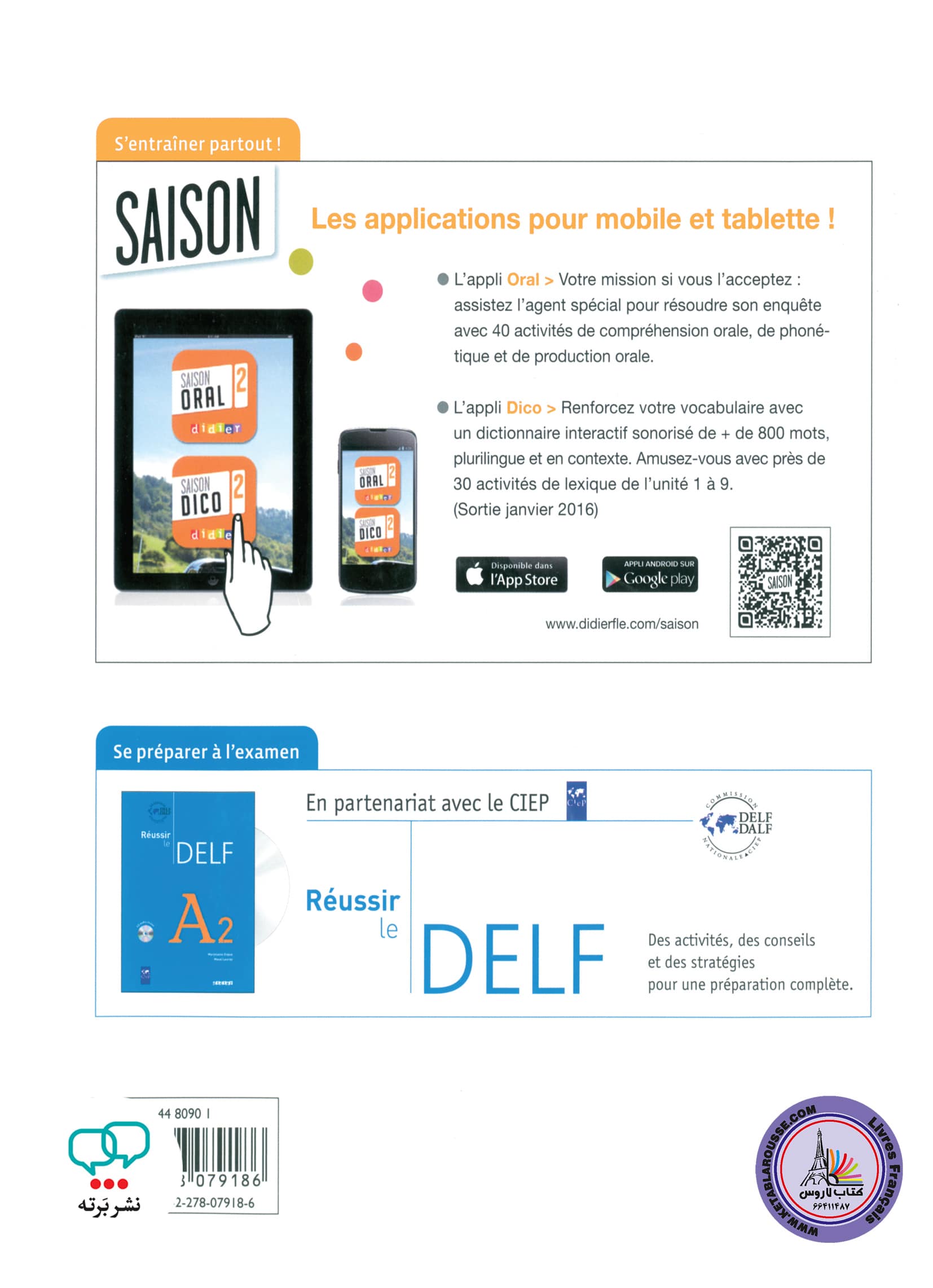 کتاب Saison 2 – A2 – B1 به گونه ای متناسب با تحقق 120 ساعت یادگیری زبان فرانسه و منطبق با استانداردهای اروپایی یادگیری زبان و با توجه به محدودیت توانمندی های ارتباطی دو سویه و کنشگرانه زبان آموز با سایرین طراحی شده است .
